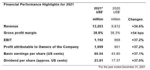 EBIT increased 37.2% to US$1.2 billion, with the EBIT margin improving by 17 basis points to 9.0%. Net Profit rose 37.2% to US$1.1 billion, with earnings per share increasing 37.1% over 2020 to US60.04 cents. With the investments in inventory to support sales growth and high service levels, the Group maintained a disciplined working capital ratio at 20.9% of sales.